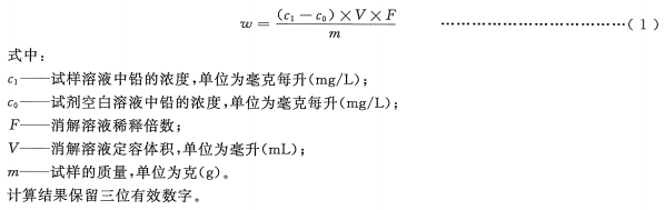 試樣中總鉛含量以鉛元素的質(zhì)量分?jǐn)?shù)ω計,數(shù)值以毫克每千克(mg/kg)表示,按式(1)計算