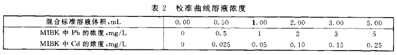 參考表2在100mL分液漏斗中加入鉛、鎘混合標準使用液(3.13),其濃度范圍應包括試樣中鉛、鎘的濃度。然后加入1mL鹽酸溶液(3.2),加水至50mL左右,以下操作同(6.1.2)。按步驟(6.2)中的條件由低到高濃度順次測定標準溶液的吸光度。