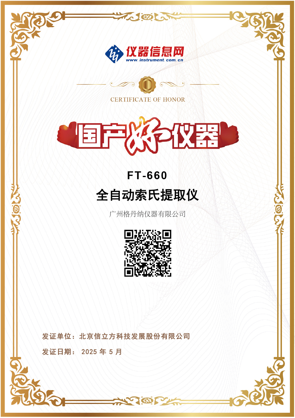 獲得《格丹納榮獲“國(guó)產(chǎn)好儀器”稱號(hào)-全自動(dòng)索氏提取儀》