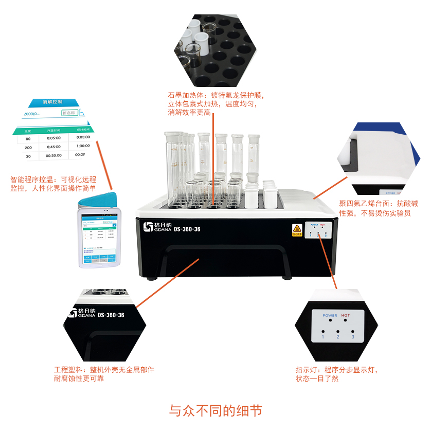 樣品前處理時間占整個分析測試時間約70%,DS-360石墨消解儀36孔樣品處理量,有效提高消解效率,節(jié)約前處理的等待時間,因而在發(fā)達國家的農(nóng)業(yè)、食品、環(huán)境、疾控、科研等領(lǐng)域得到廣泛使用。