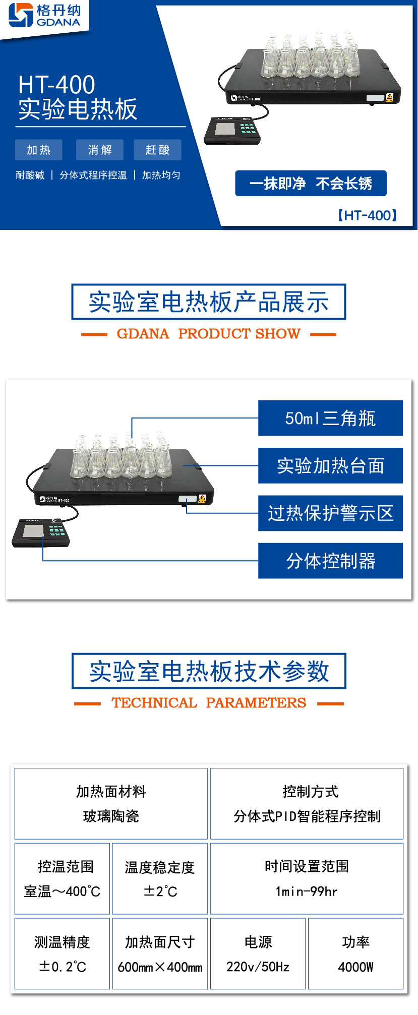 HT-400陶瓷加熱板專用于無機(jī)化學(xué)元素分析時對各類樣品作加熱、消煮、趕酸用的恒溫加熱裝置。臺面具有耐酸堿,不生銹等特性;分體PID程序數(shù)顯控溫,是實驗室樣品預(yù)處理好助手。