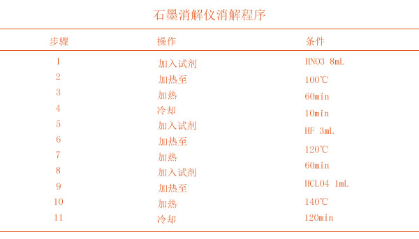 稱(chēng)取試樣0.2~0.5g(精確到0.1mg)于聚四氟乙烯消解管中,將消解管放入石墨消解裝置石墨孔中。設(shè)置消解程序進(jìn)行消解。消解完畢后冷卻至室溫,然后加入硝酸溶液(1+1)1mL溶解殘?jiān)?,轉(zhuǎn)移至50mL容量瓶中,用少量去離子水洗滌消解罐,洗滌液一并轉(zhuǎn)移至容量瓶,同時(shí)測(cè)定消解全程空白。智能石墨消解的消解程序下面見(jiàn)表1。