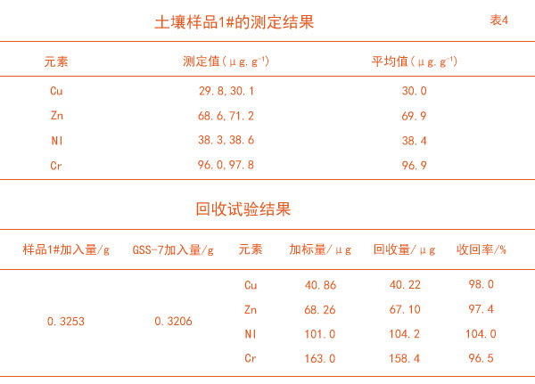 將土壤樣品1#按照消解步驟消解后進(jìn)行ICP–OES測(cè)定。然后將土壤樣品1#與GSS–7質(zhì)控樣以質(zhì)量比1∶1左右進(jìn)行加標(biāo)回收試驗(yàn),測(cè)定結(jié)果見(jiàn)表4。從表中結(jié)出各元素回收率在96.5%~104.0%之間,滿足分析要求。