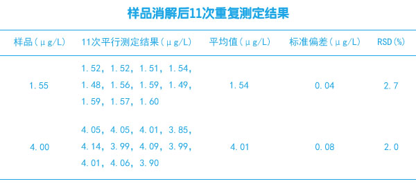 分別對(duì)濃度為1.55μg/L的固廢樣品和濃度為4.00μg/L的標(biāo)準(zhǔn)樣品消解后進(jìn)行重復(fù)測(cè)定11次,測(cè)定結(jié)果見表1。