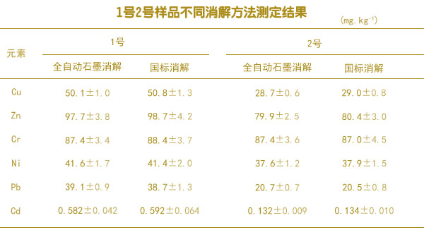 準(zhǔn)確稱取采集的樣品l號和2號樣品,分別使用全自動石墨消解法和國標(biāo)推薦法對樣品進行消解處理,每個樣品每個方法分別消解6個,統(tǒng)一測定消解液中6種重金屬元素的含量測定結(jié)果如下表。由表中可知,全自動石墨消解法和國標(biāo)推薦方法的測定值基本趨于一致。