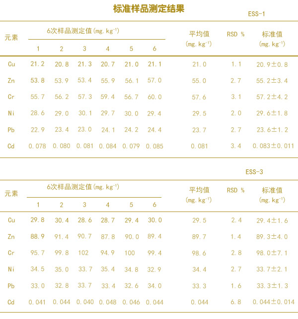 分別準(zhǔn)確稱取ESS一1和ESS一3標(biāo)準(zhǔn)土壤樣品各6份,標(biāo)準(zhǔn)樣品轉(zhuǎn)移至石墨消解儀樣品管中,放進相應(yīng)的樣品位置,統(tǒng)一測定消解液中6種重金屬元素的含量,測定結(jié)果如上面的表格。結(jié)果得出2個土壤標(biāo)準(zhǔn)樣品中的6種重金屬元素測定值均在不確定度范圍內(nèi),且相對標(biāo)準(zhǔn)偏差均小于7%。