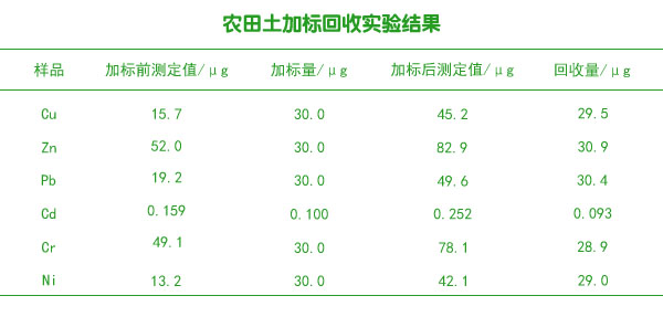 同時對農(nóng)田土進行加標實驗,平行加標3份,加標回收率進行測定,結果如下表。
