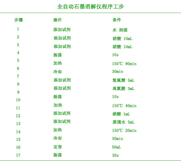 準確稱取0.5g(精確至0.0001g)試樣于全自動石墨消解儀特氟龍消解管內,并置放到全自動消解儀石墨孔中,進行編號。用少量水潤濕后,加入硝酸和鹽酸各10mL,振搖10s,在150℃溫度下加熱90min;冷卻30min后,加入5mL氫氟酸和3mL高氯酸,振搖10s,在150℃溫度下加熱40min;再加入1mL硝酸和5mL蒸餾水,在150℃溫度下繼續(xù)加熱20min;冷卻30min,用蒸餾水定容至50mL,振搖30s。全自動石墨消解儀程序消解步驟如下: