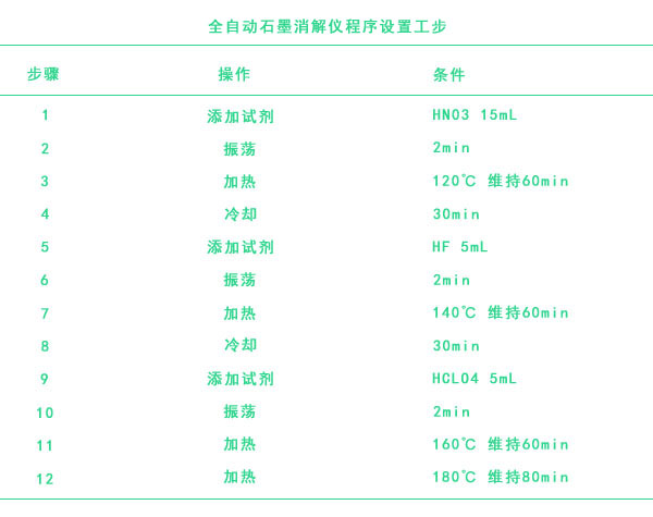 (2)全自動消解儀消解法具有操作簡便、程序自動化、無需人員值守等優(yōu)點。本實驗中全自動消解儀消解法采用HNO3+HF+HClO4體系,為研究實驗提供經(jīng)驗。