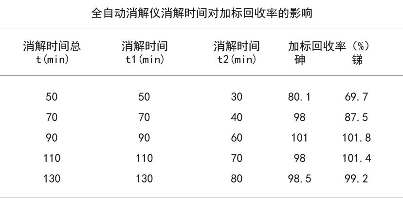 消解時(shí)間包括消解時(shí)間和趕酸時(shí)間,消解和趕酸不完全均影響樣品中As和Sb含量的測(cè)定。鑒于沒(méi)有尿樣的標(biāo)準(zhǔn)對(duì)照樣,實(shí)驗(yàn)中在尿樣加標(biāo)5μg/L的As和Sb標(biāo)準(zhǔn)混合液,通過(guò)計(jì)算回收率來(lái)考察消解時(shí)間對(duì)實(shí)驗(yàn)過(guò)程的影響。根據(jù)電熱板消解經(jīng)驗(yàn)確定幾種消解方案,在加6.0ml濃HNO3和1.5ml HClO4的情況下,考察了消解時(shí)間(總t)對(duì)加標(biāo)回收率的影響,其中t=t1+t2,消解時(shí)間(總t)在70~130min時(shí)As的加標(biāo)回收率滿足條件,在消解時(shí)間(總t)90~130min時(shí)Sb的加標(biāo)回收率滿足實(shí)驗(yàn)條件,故選擇消解時(shí)間(總t)為90min,見(jiàn)下表。