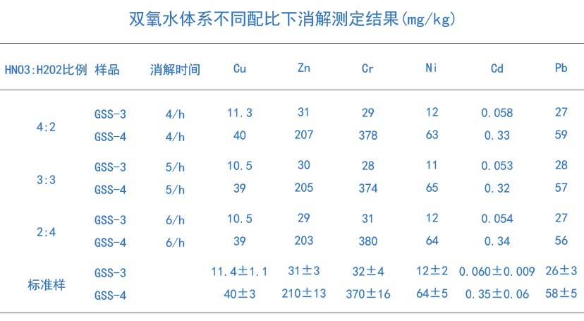 通過硝酸和雙氧水不同配比下的消解,對比兩種消解酸體系的實驗結(jié)果如下表。由表中數(shù)據(jù)可知,硝酸-氫氟酸-雙氧水體系均可以滿足銅、鋅、鉛、鎘、鉻、鎳6種重金屬元素的測定,而配比為4:2的體系消解時間更短,加入過氧化氫的次數(shù)少,這是因為過氧化氫的氧化能力隨介質(zhì)的酸度增加而增加,在HNO3:H2O2配比為4:2的配比下,氧化效率更高,確定該比例為佳比例。