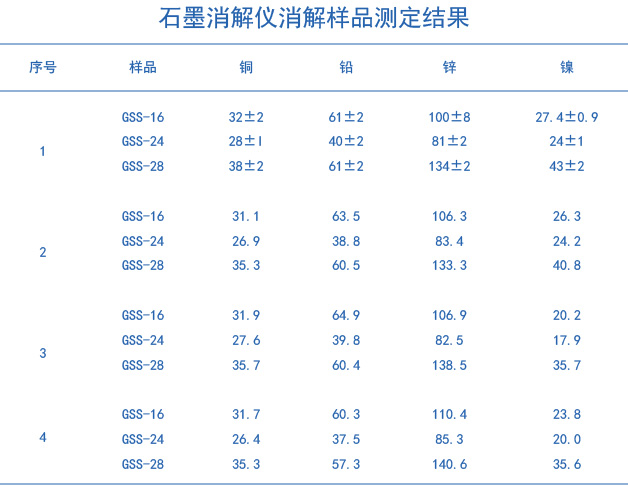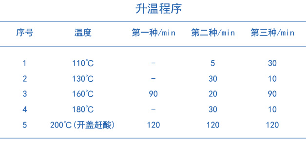 分別準確稱取(GSS-16)、(GSS-24)、(GSS-28)標準樣品各為0.200g置于聚四氟乙烯消解管中,用少量水濕潤,加入一定比例的硝酸、高氯酸、氫氟酸和鹽酸,按照無線平板上的程序升溫加熱(升溫程序如下圖表1所示),消解管加蓋,上機消解,開蓋,繼續(xù)趕酸至消解管內只剩下透明粘稠近干膏狀物,待消解管溫度降至室溫,取出消解管在通風櫥中,用慢速定量濾紙將消解后溶液過濾并用高純水定容至25mL容量瓶內,上機測定。樣品做三個平行,同時做試劑空白。