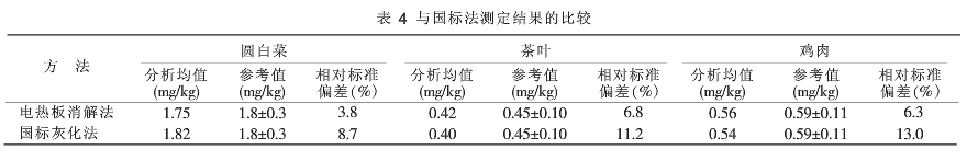 以圓白菜標(biāo)準(zhǔn)物質(zhì)(CBW10014)茶葉標(biāo)準(zhǔn)物質(zhì)(GBW10016)、雞肉標(biāo)準(zhǔn)物質(zhì)(GBW10018)為比對樣品,設(shè)置5個平行,用新建預(yù)處理方法與國家標(biāo)準(zhǔn)中灰化法同時(shí)測定3種比對樣品,并對結(jié)果進(jìn)行比較。