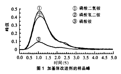 試驗(yàn)分別吸取5mL 5%硝酸鎂、磷酸二氫銨、磷酸氫二銨、磷酸銨作為基體改進(jìn)劑對鉻標(biāo)樣及樣品進(jìn)行測定,其基改劑的上機(jī)濃度為1%(體積分?jǐn)?shù))。結(jié)果(表1)表明,硝酸鎂作為基改劑時(shí),標(biāo)樣響應(yīng)值較高,標(biāo)樣與樣品測量值偏高;而選用磷酸二氫銨、磷酸氫二銨、磷酸銨為基改劑時(shí),響應(yīng)峰峰形好(圖1),測定結(jié)果沒有差異,回收率也在范圍內(nèi)。但選用的磷酸二氫銨、磷酸氫二銨溶液作空白測 定時(shí),空白值偏高。因此,選擇5%磷酸銨作為鉻測定的基體改進(jìn)劑,這與國標(biāo)法選用的一致。