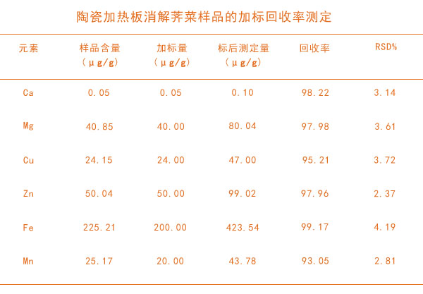 采用陶瓷加熱板消解薺菜測定金屬元素的含量是比較常規(guī)的消解設(shè)備,陶瓷加熱板具有較大加熱臺面,可以進(jìn)行大批量前處 理,敞開式消解與遠(yuǎn)程的控制,實驗安全,操作簡單。玻璃陶瓷臺面一抹即凈,清潔相當(dāng)方便,濕法消解體系也比較成熟對薺菜的消解效果較好。