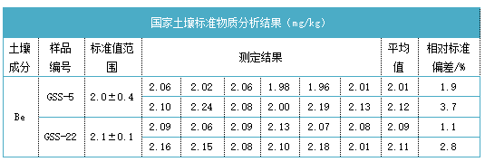 由上表可知對土壤標準樣品GSS-5和CSS-22的鈹成分進行分析,陶瓷電熱板消解法的分析結(jié)果都在標準值范圍內(nèi);陶瓷電熱板消解方法對兩種不同濃度的土壤實際樣品中的鈹進行消解,分析結(jié)果相對偏差較低,精密度較好;加標回收實驗因電熱板消解的環(huán)境是敞開式的,難免會受到周圍工作環(huán)境的影響,但總的來說,回收率效果還是不錯的,達到了84~100%,準確率也高。